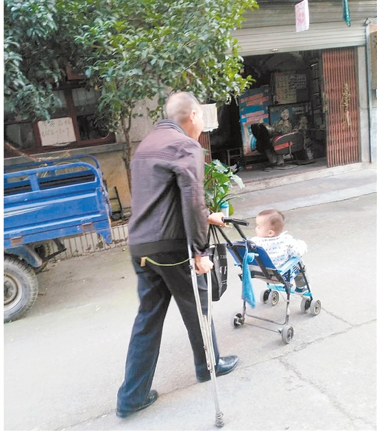 尽管老人腿脚不便,但是老人仍然推车携孙散步,这个画面不禁让人感叹亲情的力量。