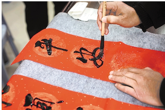 一幅散发着清新墨香的喜庆春联即将“出炉”,祝福着人们平安过一生。 拍客:苗青