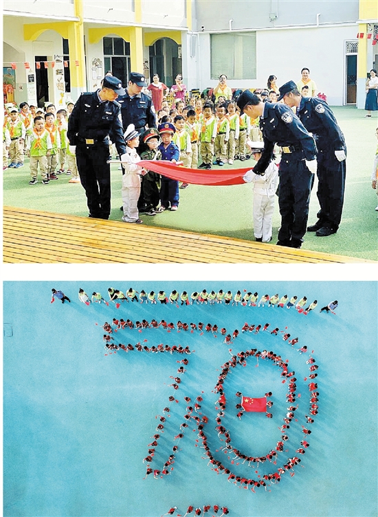 花园幼儿园师生站出“70”字样。