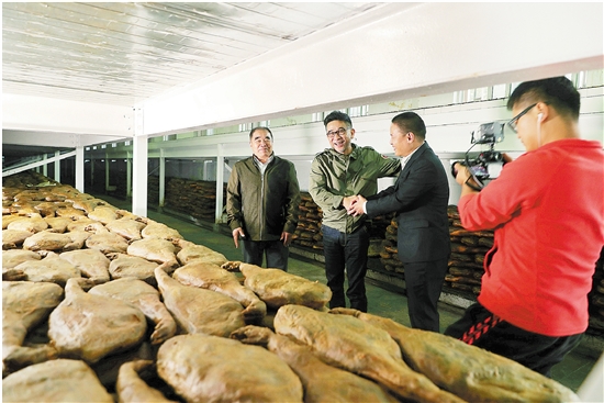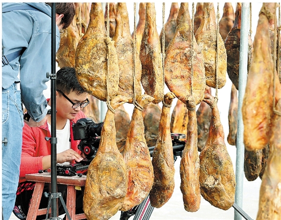 10月24日,杭州外婆家创始人吴国平正在老汤火腿公司接受央视十套摄制组采访拍摄《历久弥新》专题片。去年底,外婆家集团旗下推出一个新品牌——老鸭集,主打杭州老鸭煲,一推出就深受广大食客喜爱,而其中一道食材——老汤牌金华火腿起到相当重要的作用。此前,吴国平曾多次到访老汤火腿公司,探寻传统工艺制作金华火腿的奥秘,只为把最鲜美的鸭子分享给更多食客。 (本报记者王江红摄)