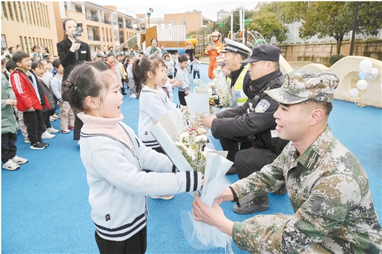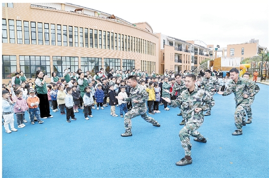 3月12日,花园外国语幼儿园举办“致敬最可爱的人”主题活动,通过观看格斗表演、参加集体军训、进行角色扮演等方式,认识并致敬武警、民警、特警、交警、消防员等这群最可爱的人,在深入开展爱国主义教育的同时,进一步了解更多安全防护知识。 (本报记者周振平摄)