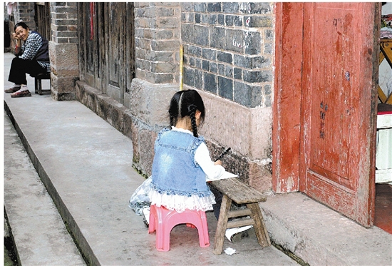 一边是悠闲自在的妇女,一边是刚步入校园的幼童。一闲一忙,不禁让人感慨。