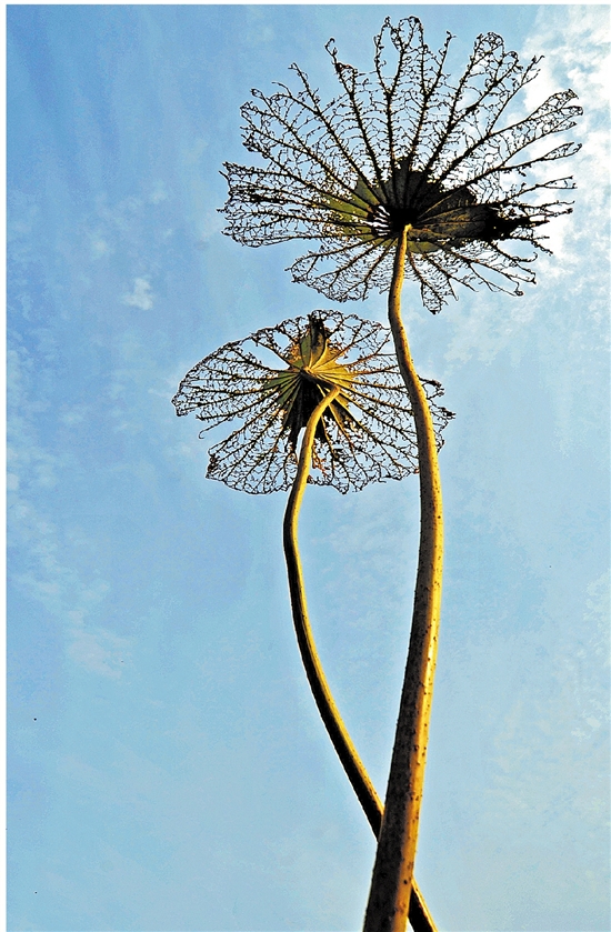 荷塘里两支高耸入云的荷叶只剩下经纬交错的叶脉,像极了两把打开的花花伞。