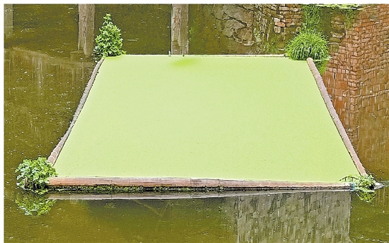水塘中央的竹架子里,长满绿色的浮萍,像盖着一条厚厚的“绿毯”。