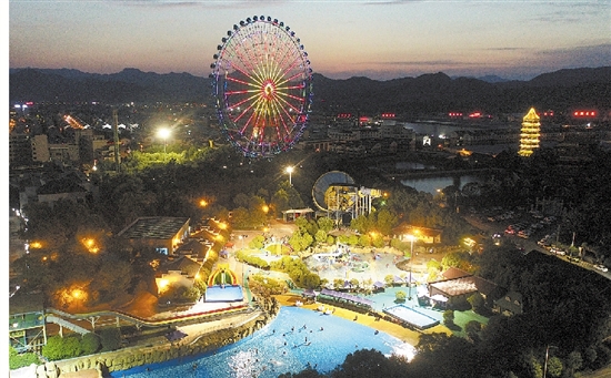 7月10日,花园村88米高的摩天轮在夜幕下变幻出不同的图案,与海浪池、水寨、大喇叭等水世界夏日清凉之地相映成趣,为现代乡村绘就出不同寻常的夜景,让国家AAAA级旅游景区、浙江省5A级景区镇更加绚丽多彩。 (本报记者王江红摄)