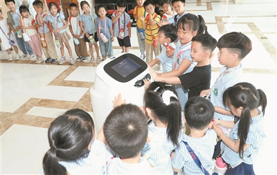 图为5月23日,花园外国语幼儿园组织小朋友来到花园大厦现场体验了解送餐服务智能机器人。 王江红摄