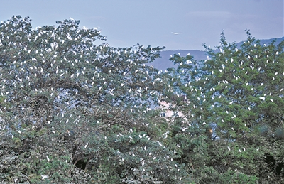 白鹭栖息树枝桠,胜似盛开玉兰花。