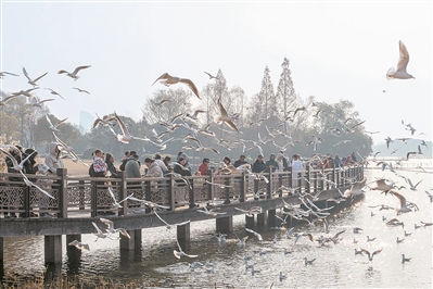 《鸥翔人欢》 湖鸥飞翔,游客投喂,人鸟和谐相处。 拍客:穆平