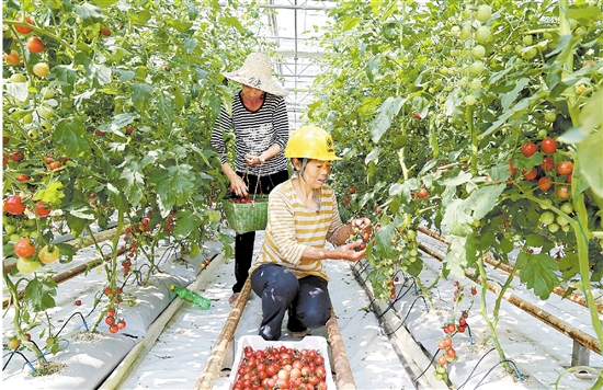 5月22日,花园现代农业生态园全自动玻璃温室大棚里,花园农发公司工作人员正在采摘小番茄、小黄瓜、甜椒、茄子等果蔬。自搬迁到新址以来,花园农发公司积极推进现代设施农业建设,全自动玻璃温室大棚以及一大批塑料联动大棚陆续建成并投入使用,如今已迎来了一批批好收成,为市场供应优质可口的新鲜蔬果。 (本报记者周振平摄)