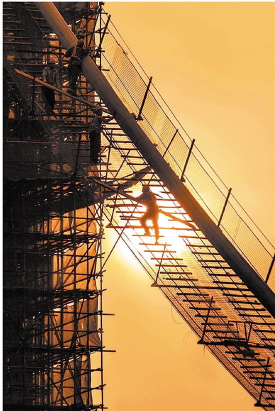建筑工人高空作业,用汗水浇筑城市美。