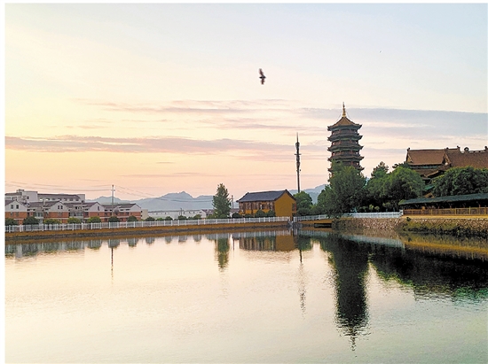 南山寺的万福塔、湖面上的小鸟以及远处的村民住宅出现在同一画面里,相映成趣。