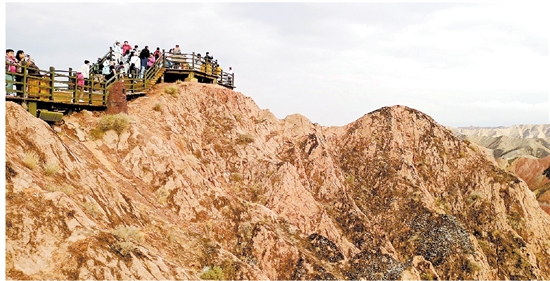起伏的群山上,站在最高处观景台上的人群成为了画面中最高的“山峰”。