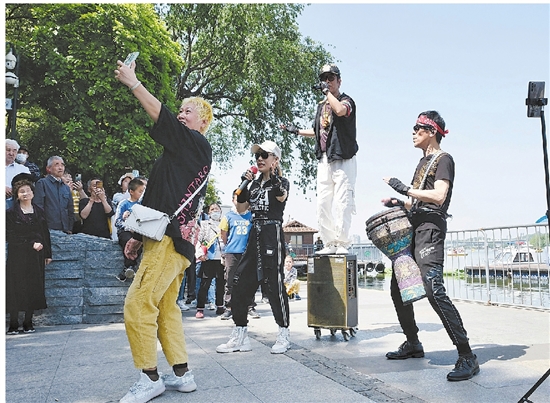 几位民间艺人即兴表演拿手节目为游客助兴,欢度周末假期时光。