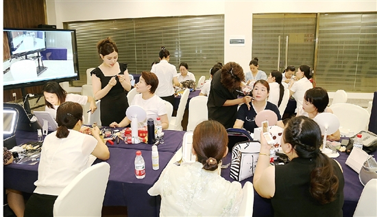 8月6日,花园红木家具城经营户及营业员们正在专业化妆师指导下学习各种化妆知识。随着商家线上平台拍摄视频出镜机会越来越多,连日来,中木协花园红木专业委员会特组织开展化妆培训课,搭建一个学习和分享化妆知识的优质平台,助力商家们在直播等镜头下展现更美丽更自信的形象。 (周振平摄)