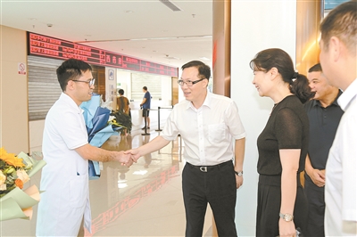 8月19日是第七个“中国医师节”,主题是“崇尚人文精神 彰显医者仁心”。当天上午,东阳市领导方宪文、李敢峰、楼国民一行来到花园田氏医院开展慰问并为医师们送上鲜花等,感谢他们一直以来奋战在医疗服务一线,以实际行动诠释医者仁心,为护佑群众健康、推动卫生健康事业发展作出积极贡献。此外,花园田氏医院负责人也走进各科室,为全体医师们送上节日的问候与祝福。(周振平摄)