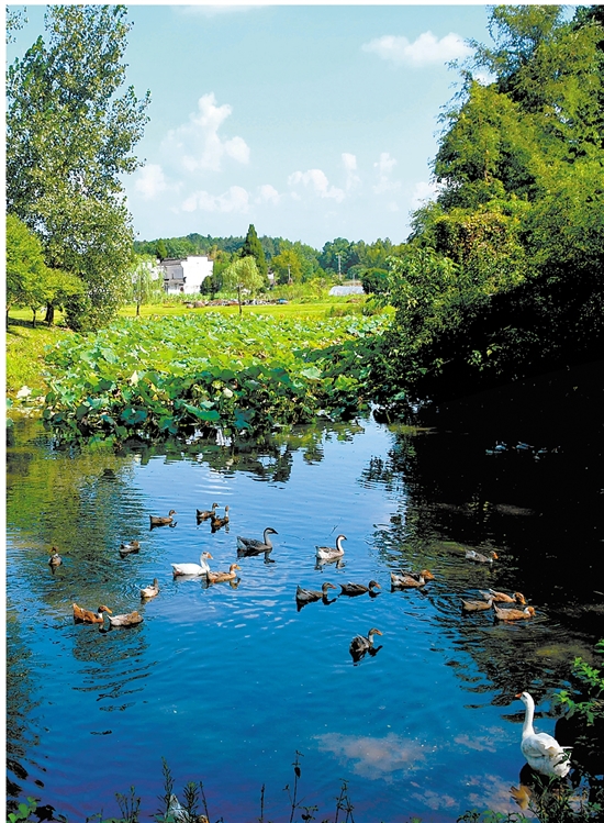 荷花池塘,鸭子戏水。