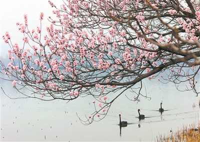 《美丽画卷》 粉樱垂岸弄清波,黑鹅衔春入画来。 拍客:罗时东